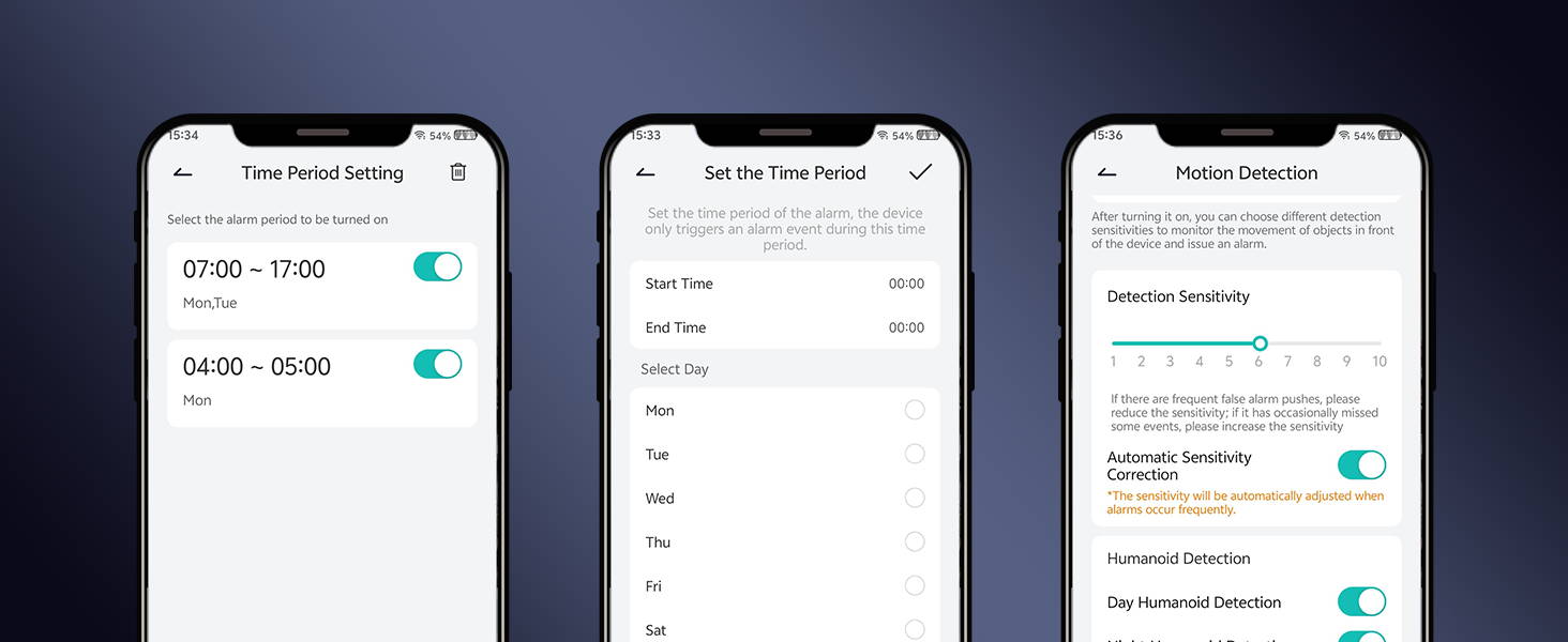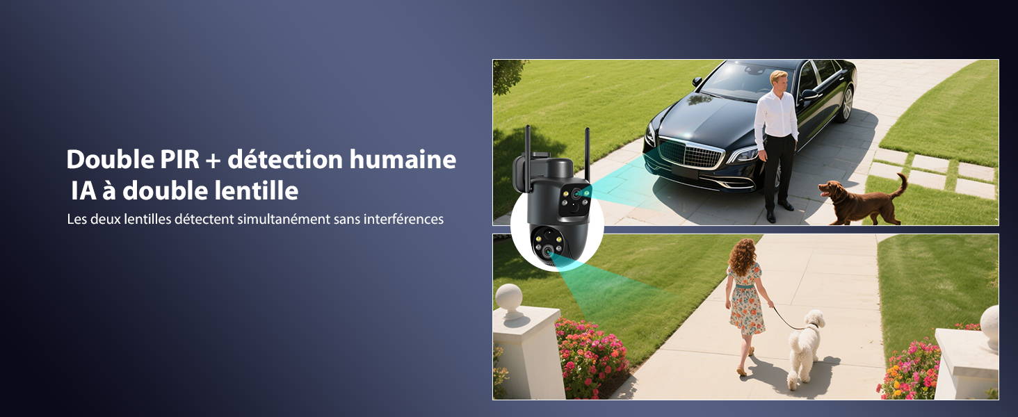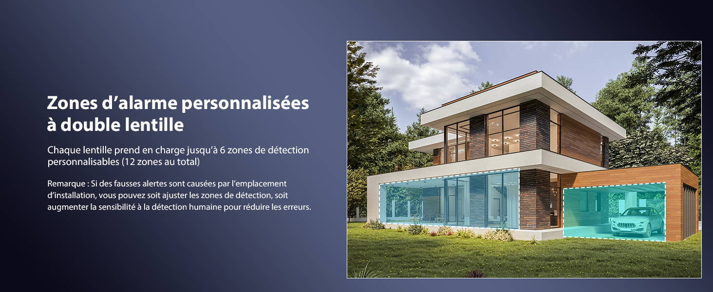 (1) Détection PIR + Forme humaine pour réduire les fausses alertes (2) Double capteur PIR – chaque lentille déclenche les alertes indépendamment (3) Chaque caméra peut avoir une zone d’alerte définie indépendamment. Les objets hors zone ne sont pas détectés, ce qui réduit les fausses alertes. La période horaire d’alerte peut aussi être configurée.