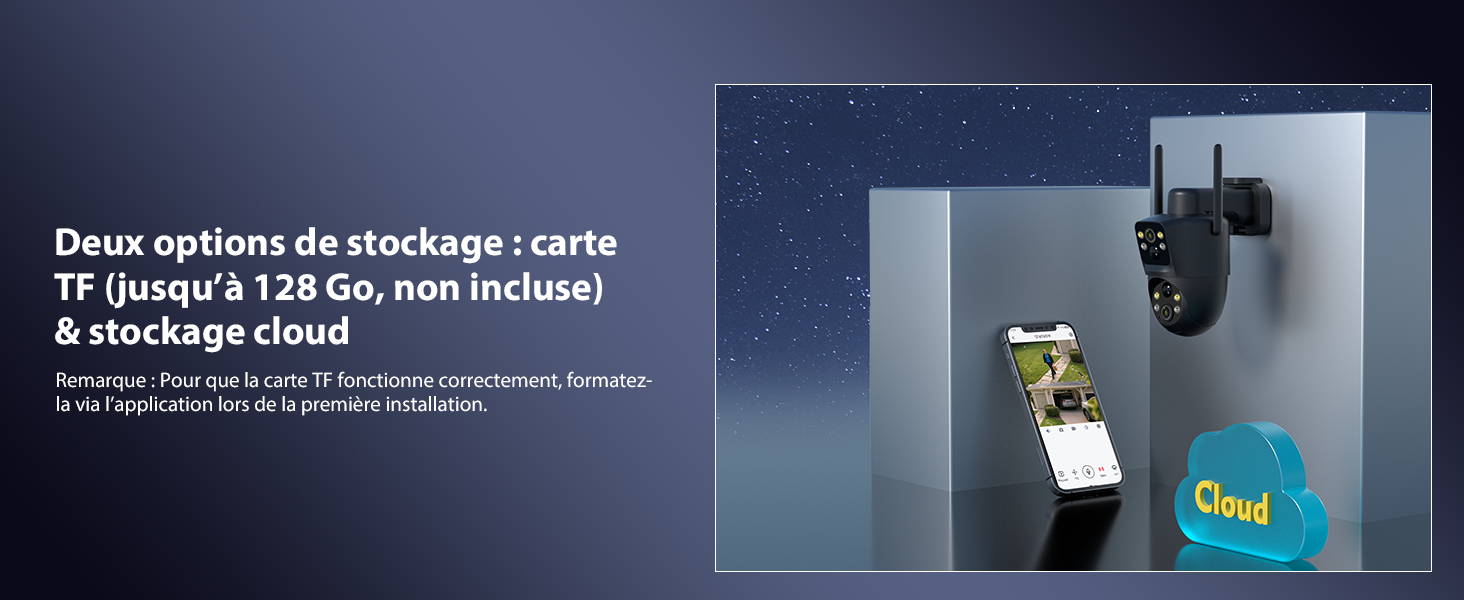 Carte TF (jusqu’à 128 Go, vendue séparément), stockage Cloud (enregistrement de 6 secondes avec couverture en boucle sur 7 jours)