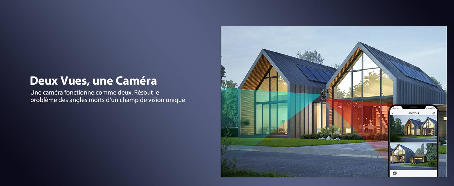 La caméra de sécurité extérieure sans fil Q3 offre 2 caméras en 1, ce qui correspond à une caméra PT combinée à une caméra bullet fixe. Grâce à ses deux objectifs, ses deux capteurs PIR et sa double détection des personnes, ses objectifs supérieur et inférieur fonctionnement indépendamment l'un de l'autre, vous permettant ainsi de surveiller deux zones en même temps. Grâce à l'application Cloudedge/Cococam, vous pourrez visualiser simultanément les deux flux en direct, tandis que l'objectif inférieur pourra être ajusté à distance via les commandes PT(355°P 90°T) afin de modifier la zone de surveillance.