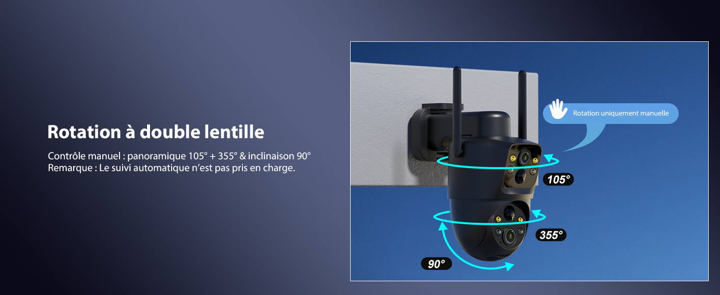Caméra supérieure : rotation manuelle à 105°;Caméra inférieure: contrôle PTZ 355° horizontal/ 90° vertical