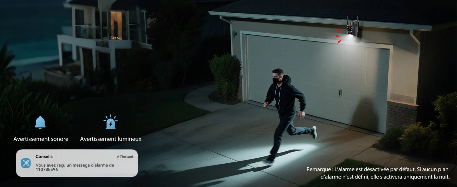La caméra de sécurité à double objectif vous aide à sécuriser votre maison grâce à une couverture plus large. Quand l'alarme sonore et lumineuse (désactivée par défaut) est activée, si une personne pénètre dans vos zones d'alerte prédéfinies, la caméra wifi sans fil extérieure déclenche une alarme sonore et lumineuse pour faire fuir l'intrus. Si le programme d'alarme est désactivé, l'alarme sonore et lumineuse ne s'activera que la nuit. Il est également possible de personnaliser un calendrier d'alerte pour permettre à la caméra de surveiller votre maison même pendant la journée lorsque vous n'êtes pas là.
