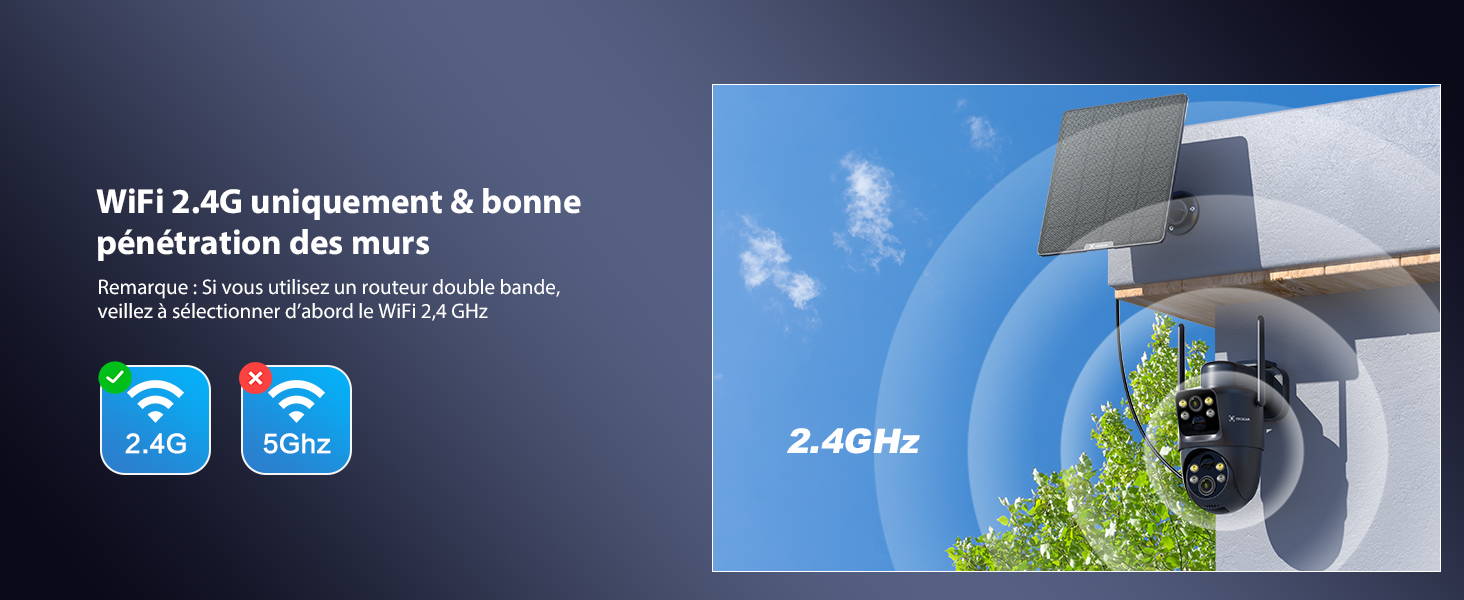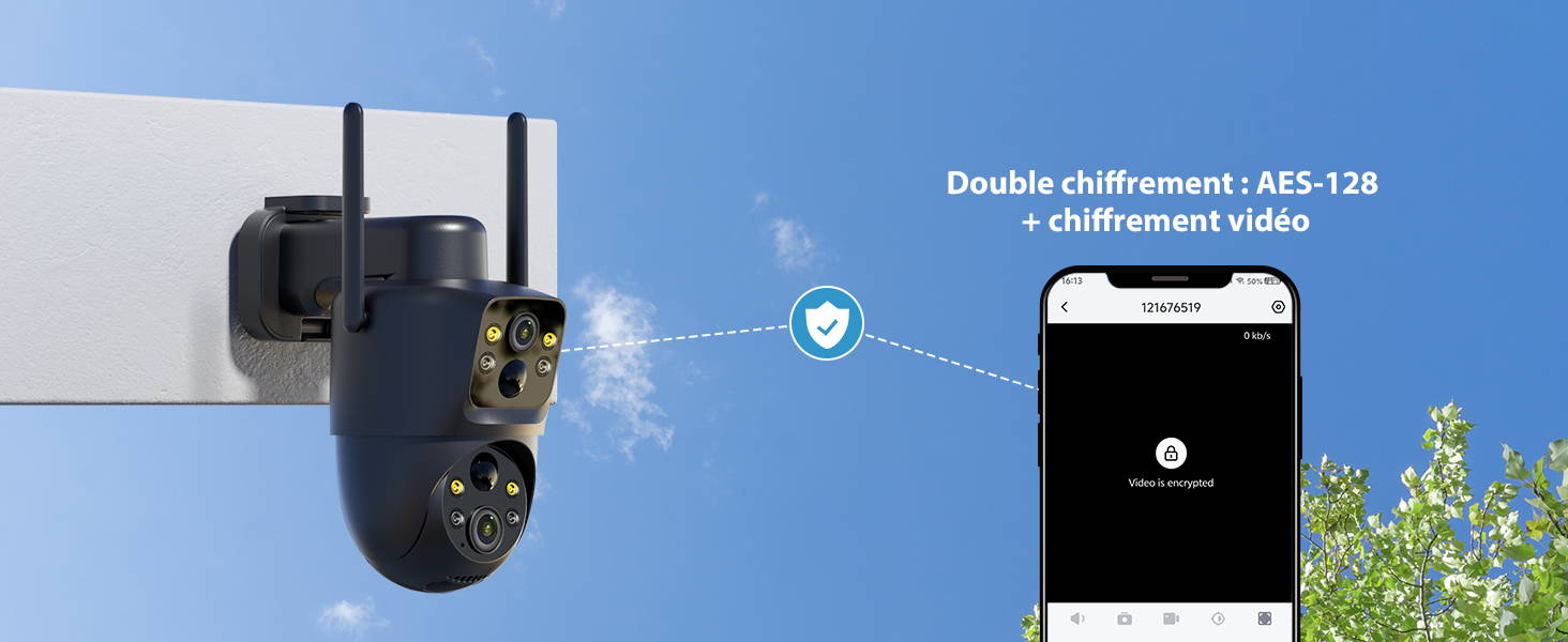 Cette caméra de sécurité solaire à double objectif sans fil est équipée d'un système de chiffrement AES 128 bits et d'une protection par mot de passe. Quand vous configurez un mot de passe, la vision en temps réel et la lecture du stockage sur le cloud nécessitent une authentification par mot de passe afin de protéger votre vie privée. Compatible avec les cartes TF (jusqu'à 128 Go, non fournies) et le stockage sur le cloud (enregistrement en 6 secondes et couverture en boucle de 7 jours). Elle est compatible avec le Wi-Fi 2.4GHz uniquement (5GHz non pris en charge).