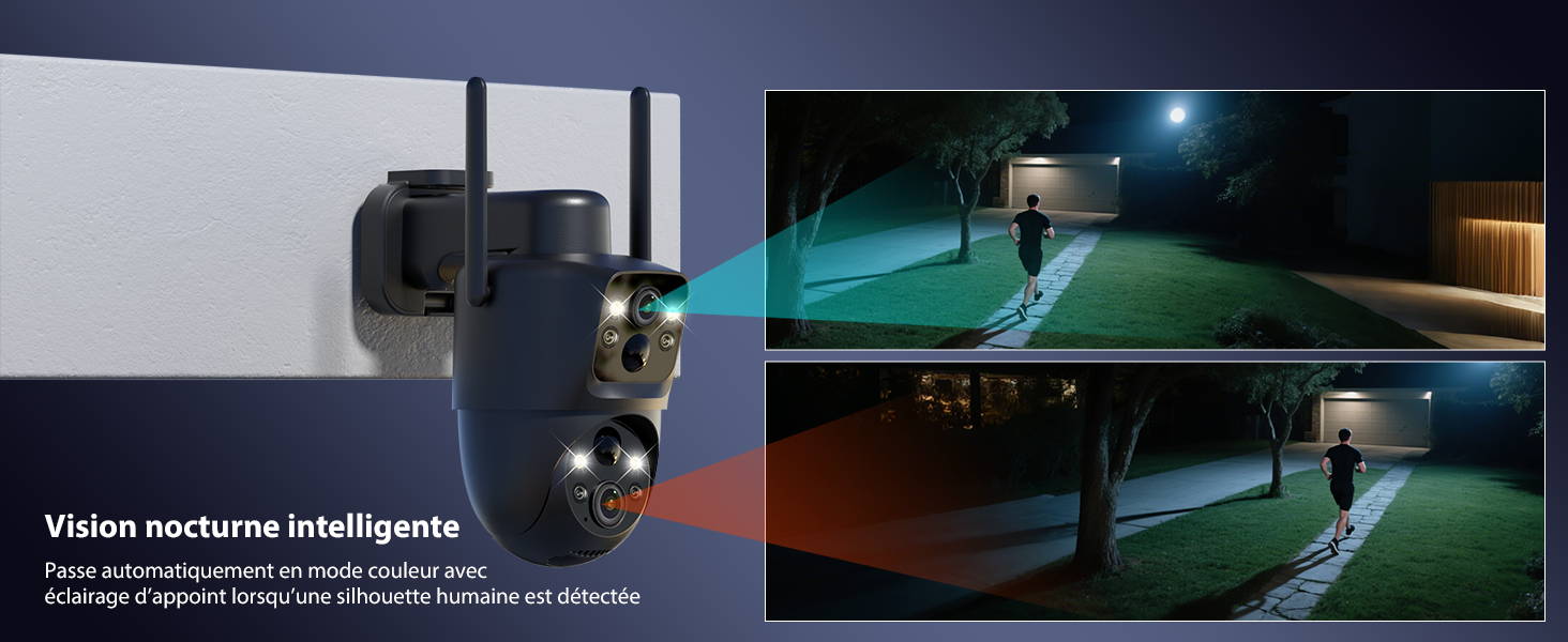 Cette caméra solaire d'extérieur à double lentille 2K 3MP Wifi capture des détails exceptionnels pour une qualité visuelle supérieure. Visibilité optimale même la nuit. La vision nocturne intelligente permet de basculer automatiquement entre le mode infrarouge (en cas d'inoccupation) et le mode couleur avec spot blanc (en cas de détection d'un être humain). Cette vision nocturne peut atteindre 25 m en lumière blanche et 30 m en infrarouge. Solution parfaite pour assurer la sécurité des habitations (allées, cours, jardins, garages) et la surveillance nocturne se fait sans stress.
