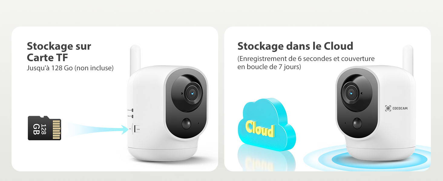 Carte TF (jusqu'à 128 Go, vendue séparément), stockage dans le Cloud. Enregistrement en boucle de 6s et 7 jours (uniquement pris en charge lors de l'utilisation de la carte SIM intégrée de notre caméra)