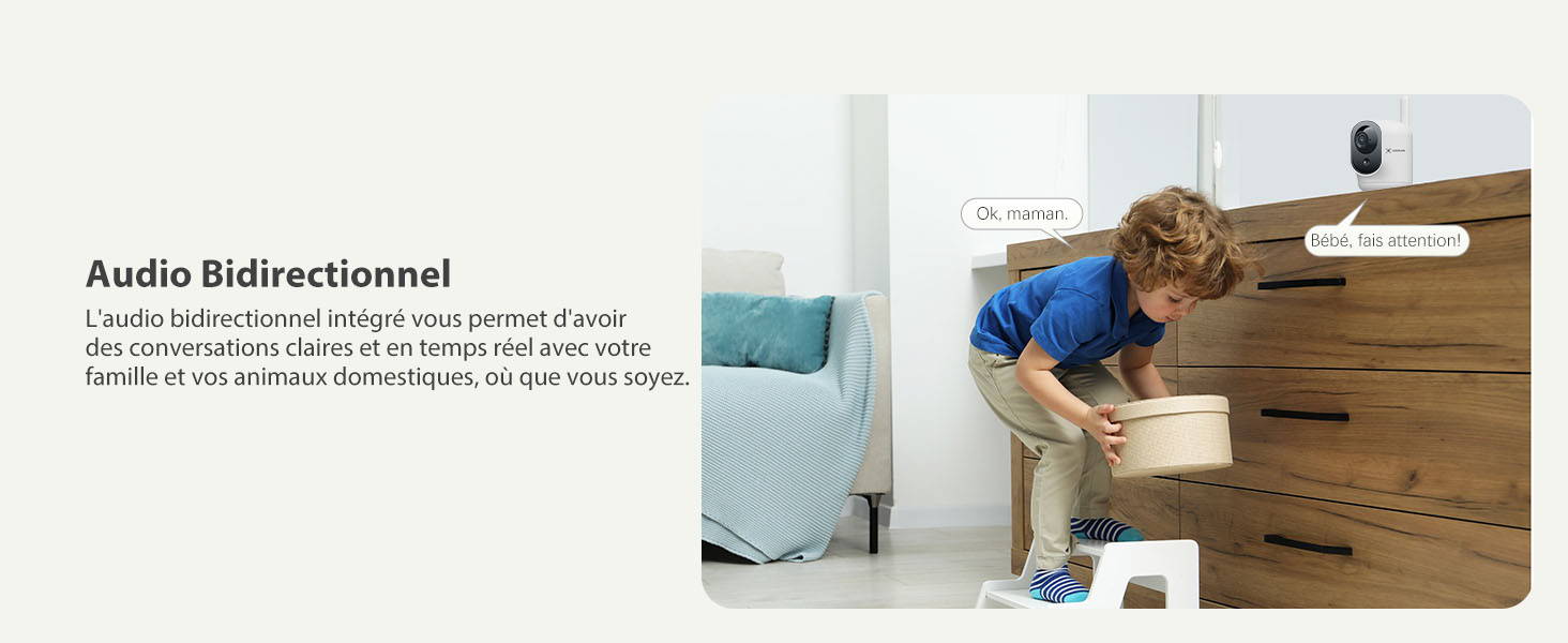 Gardez le contact avec un son bidirectionnel clair et activez manuellement le son de l'alarme en cas de besoin. elle permet également de définir des zones d'alerte personnalisées pour réduire les fausses alarmes. Compatible avec Alexa et Google Assistant, cette caméra intérieur 4G s'intègre parfaitement à votre écosystème de maison intelligente.