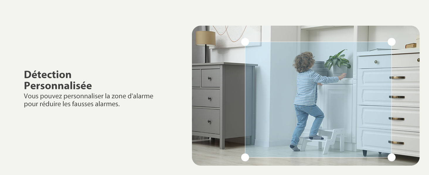 Pour garantir un stockage normal de la carte TF, veuillez choisir de formater la carte TF dans l'Appli en installant la carte TF pour la première fois.2 S'il y a une fausse alarme à l'endroit où vous l'installez, vous pourrez personnaliser la zone d'alarme ou augmenter la sensibilité de la détection humaine afin de réduire les fausses alarmes.