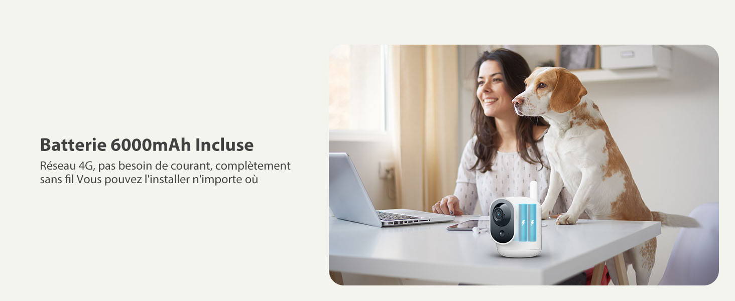 La caméra intérieure 4G est accompagnée d'une batterie rechargeable de 6 000 mAh, permettant environ 4 000 à 5 000 déclenchements sur une charge complète (l'alimentation 5 V 2 A charge pendant 6 à 8 heures).