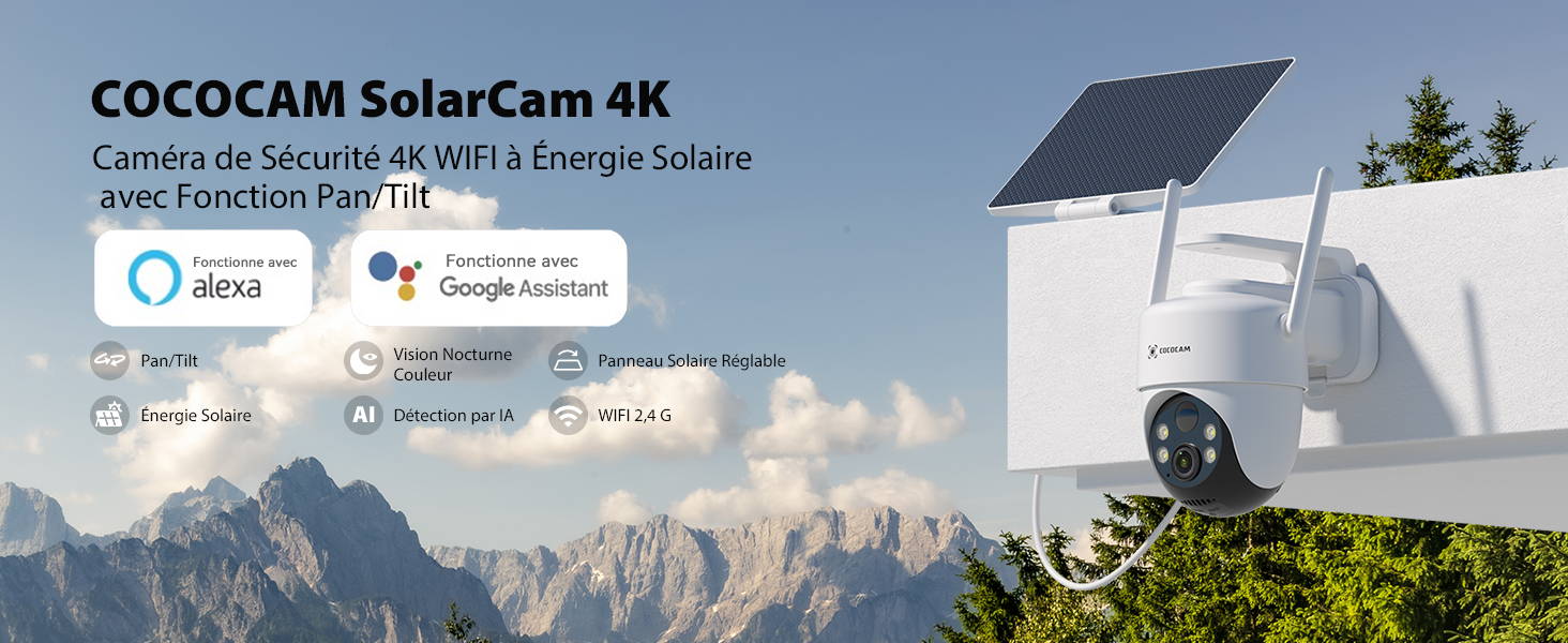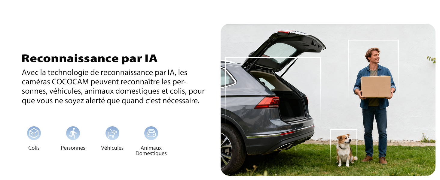 la caméra de sécurité extérieure sans fil est dotée d'une détection par IA avancée pour les personnes, véhicules, animaux domestiques et colis (La détection des colis et des animaux domestiques entraîne des frais supplémentaires.). Elle est parfaitement compatible avec Alexa et Google Assistant et prend en charge le contrôle vocal et alertes en temps réel, améliorant ainsi votre expérience de domotique.