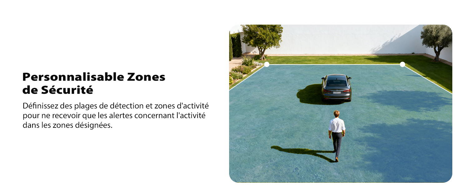 1 - Pour garantir le stockage normal de la carte TF, lors de la première installation de la carte TF, veuillez choisir de formater la carte TF dans l'application. 2 - Si des fausses alarmes se déclenchent à votre emplacement d'installation, vous pouvez personnaliser la zone d'alarme ou augmenter la sensibilité de la détection d'humains pour de réduire les fausses alarmes. 3 - La détection des colis et des animaux domestiques nécessite un paiement supplémentaire.