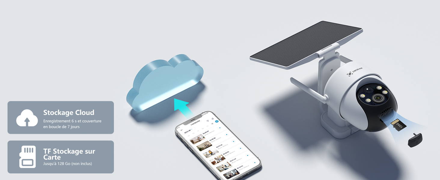 Carte TF (jusqu'à 128 Go, vendue séparément), stockage Cloud (enregistrement de 6 secondes et couverture en boucle de 7 jours)