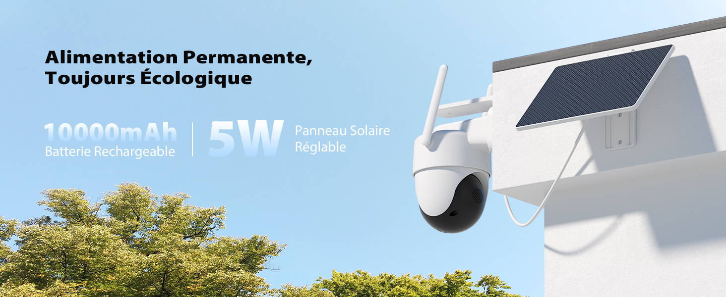 La caméra extérieure sans fil est dotée d'une batterie rechargeable de 10 000 mAh et d'un panneau solaire de 5 W, permettant environ 4 000 à 5 000 déclenchements lorsqu'elle est complètement chargée (chargeur 5 V 2 A pendant 8 à 10 heures).